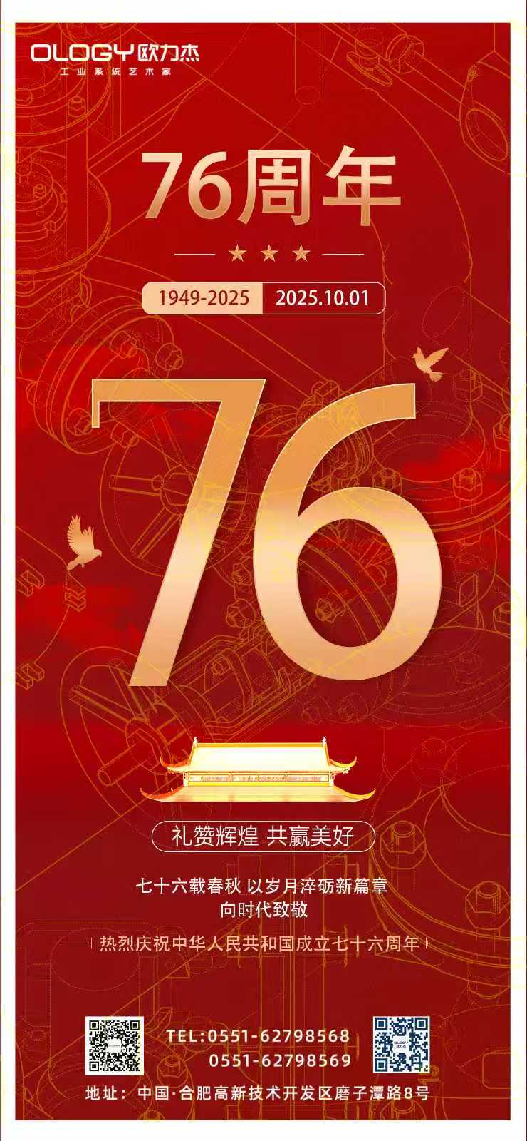 七十六載崢嶸歲月,二十二載春華秋實(shí)。此次三慶同賀,不僅是一次情感的凝聚,更是一次力量的匯聚。站在新的歷史起點(diǎn)上,合肥歐力杰智能裝備系統(tǒng)有限公司將繼續(xù)秉持“尊重、包容、創(chuàng)新、擔(dān)當(dāng)、協(xié)作、共贏”的企業(yè)精神,把對祖國的深厚情懷轉(zhuǎn)化為推動企業(yè)高質(zhì)量發(fā)展的強(qiáng)大動力,在實(shí)現(xiàn)中華民族偉大復(fù)興的征程中,不斷書寫屬于歐力杰的精彩華章!