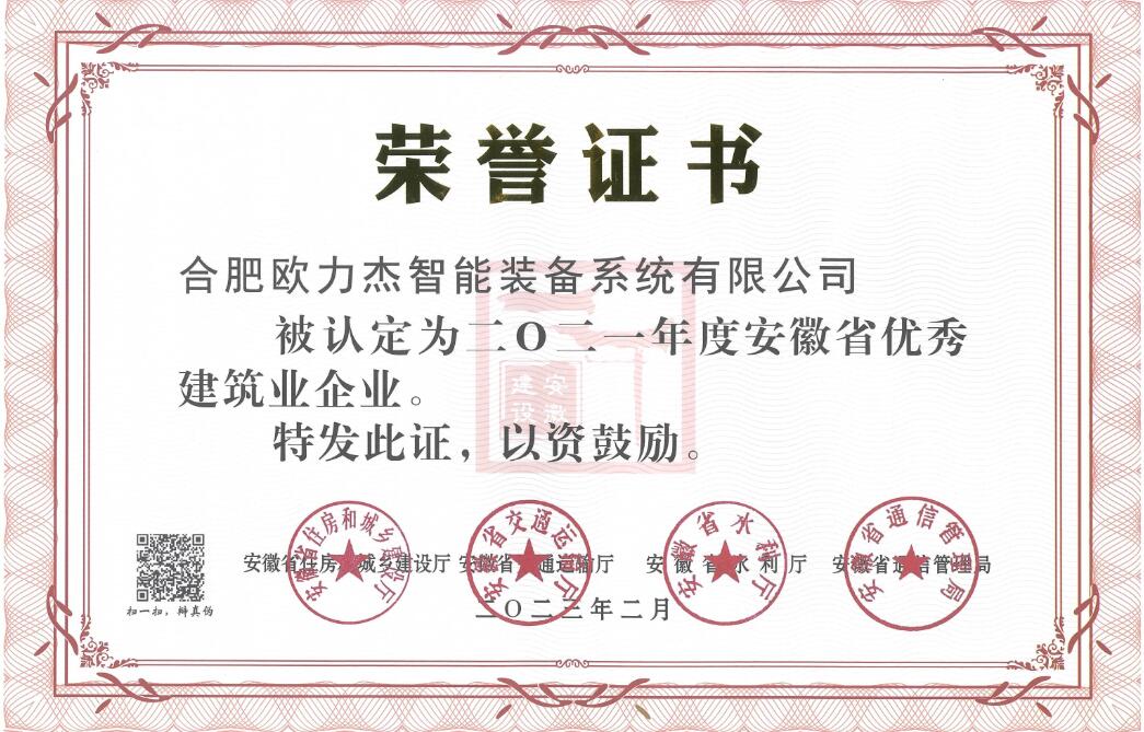 熱烈祝賀合肥歐力杰智能裝備系統(tǒng)有限公司榮獲2021年度安徽省優(yōu)秀建筑業(yè)企業(yè)。該榮譽(yù)由安徽省住房和建設(shè)廳、安徽省交通運(yùn)輸廳、安徽省水利廳、安徽省通訊管理局四部門(mén)于2023年2月統(tǒng)一評(píng)選認(rèn)定。