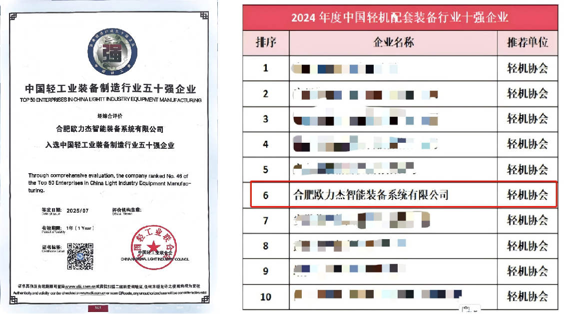 由中國(guó)輕工機(jī)械協(xié)會(huì)推薦的合肥歐力杰智能裝備系統(tǒng)有限公司憑借卓越的技術(shù)創(chuàng)新能力和行業(yè)貢獻(xiàn),成功入選“2024年度中國(guó)輕工業(yè)裝備制造行業(yè)五十強(qiáng)企業(yè)”及“2024年度中國(guó)輕機(jī)配套裝備行業(yè)十強(qiáng)企業(yè)”雙項(xiàng)榜單,彰顯了企業(yè)在輕工機(jī)械領(lǐng)域的領(lǐng)先地位。